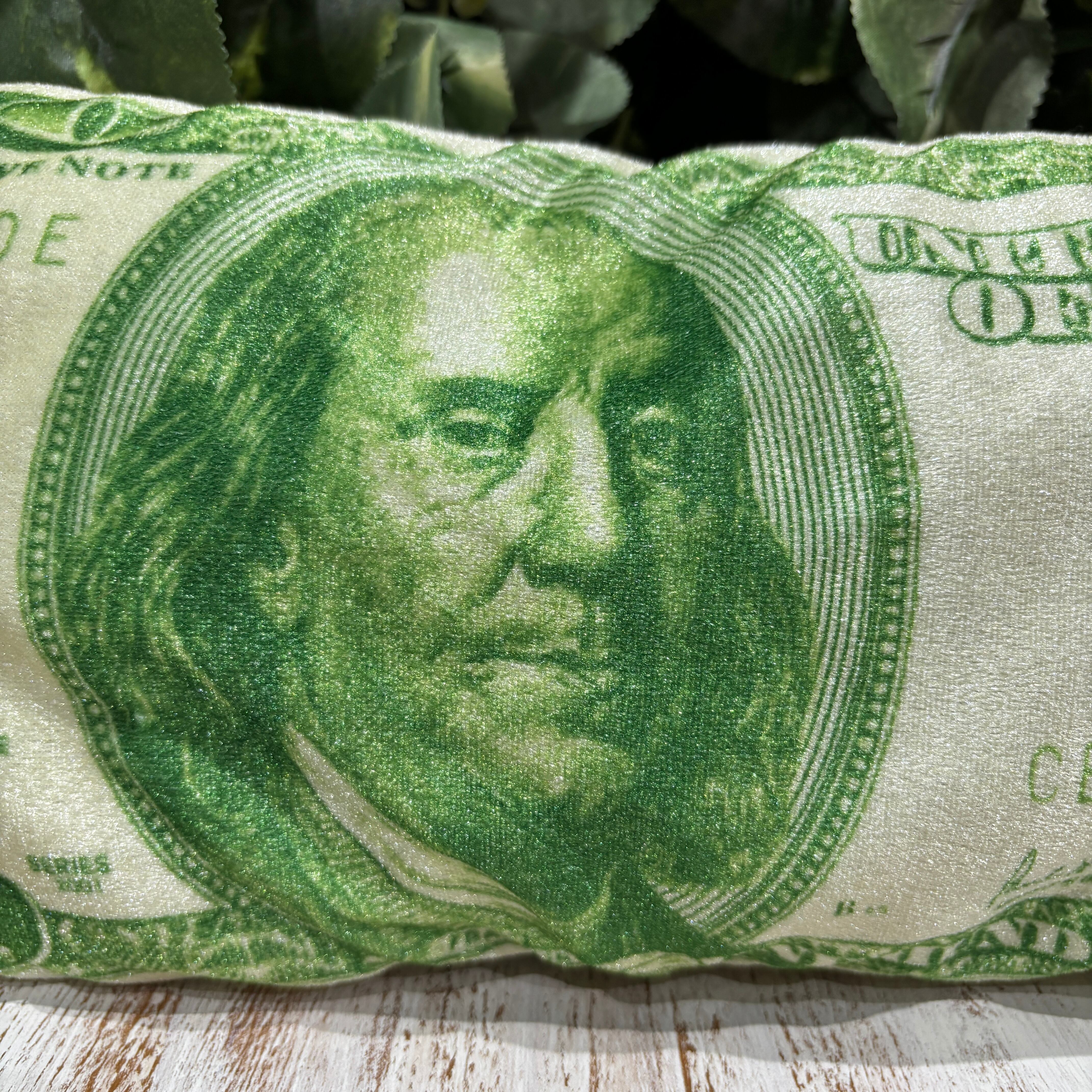 ベロア素材でテカテカしたアメリカ100ドル紙幣のミニクッション☆